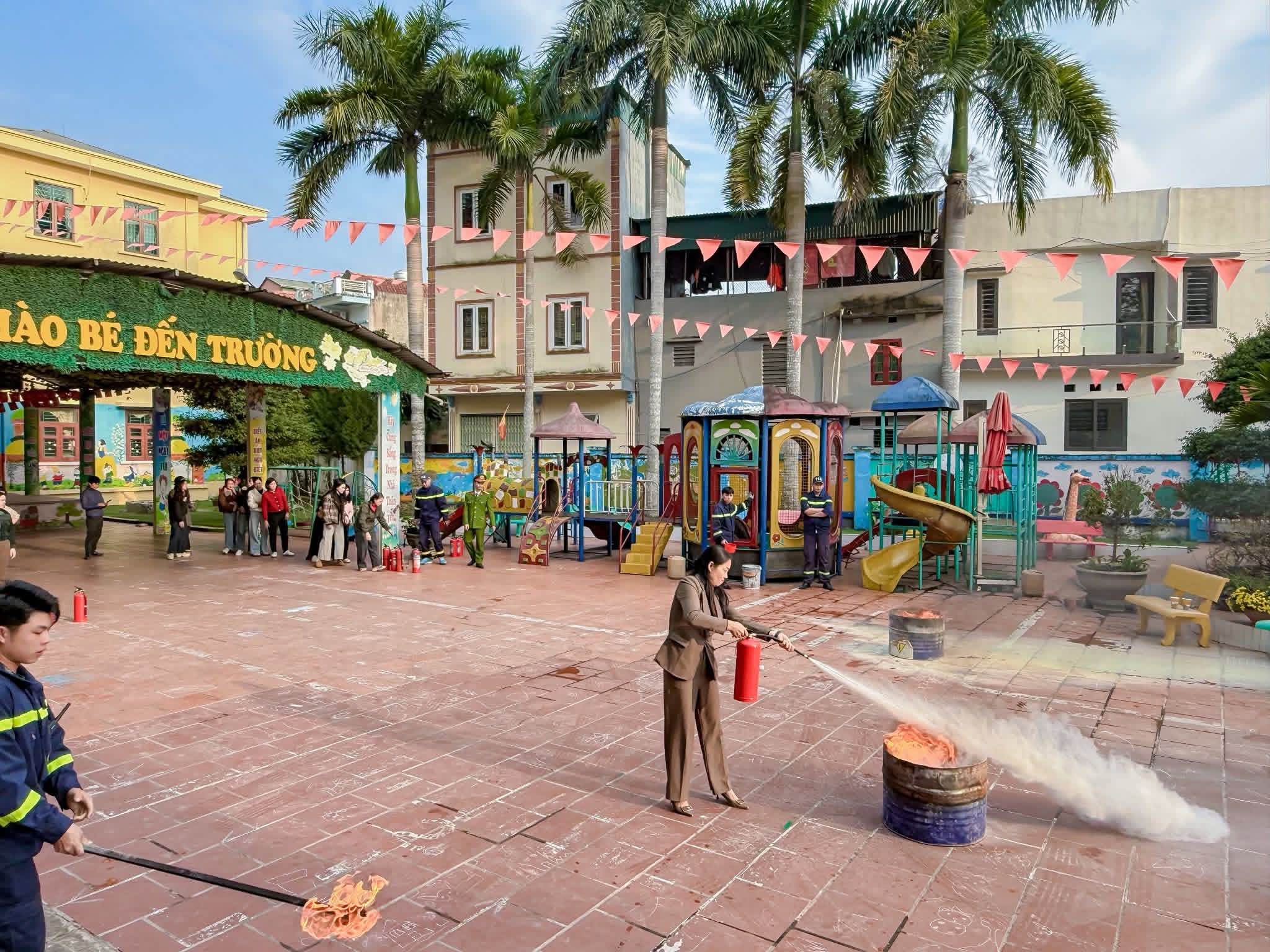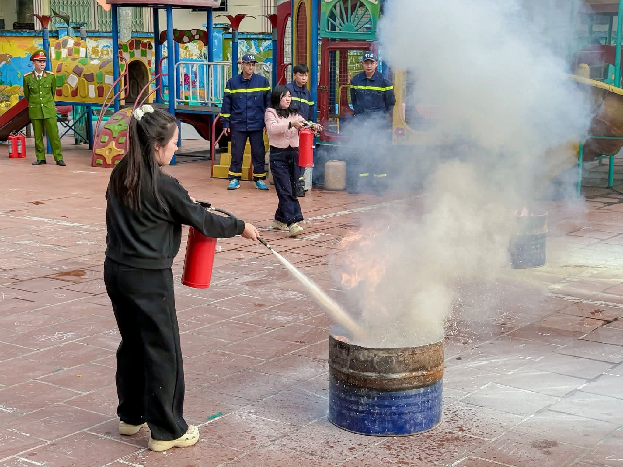 ✨Tại buổi tập huấn, các cô được trang bị kiến thức PCCC cơ bản, hướng dẫn kỹ năng thoát hiểm, di chuyển đồ dùng, cứu người và trực tiếp thực hành dập lửa bằng bình chữa cháy trong các tình huống giả định.